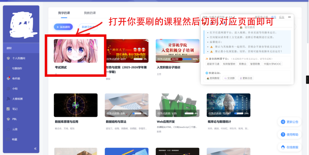 在网页打开你需要刷的课程,开始播放视频,脚本会帮你完成剩下的事情。