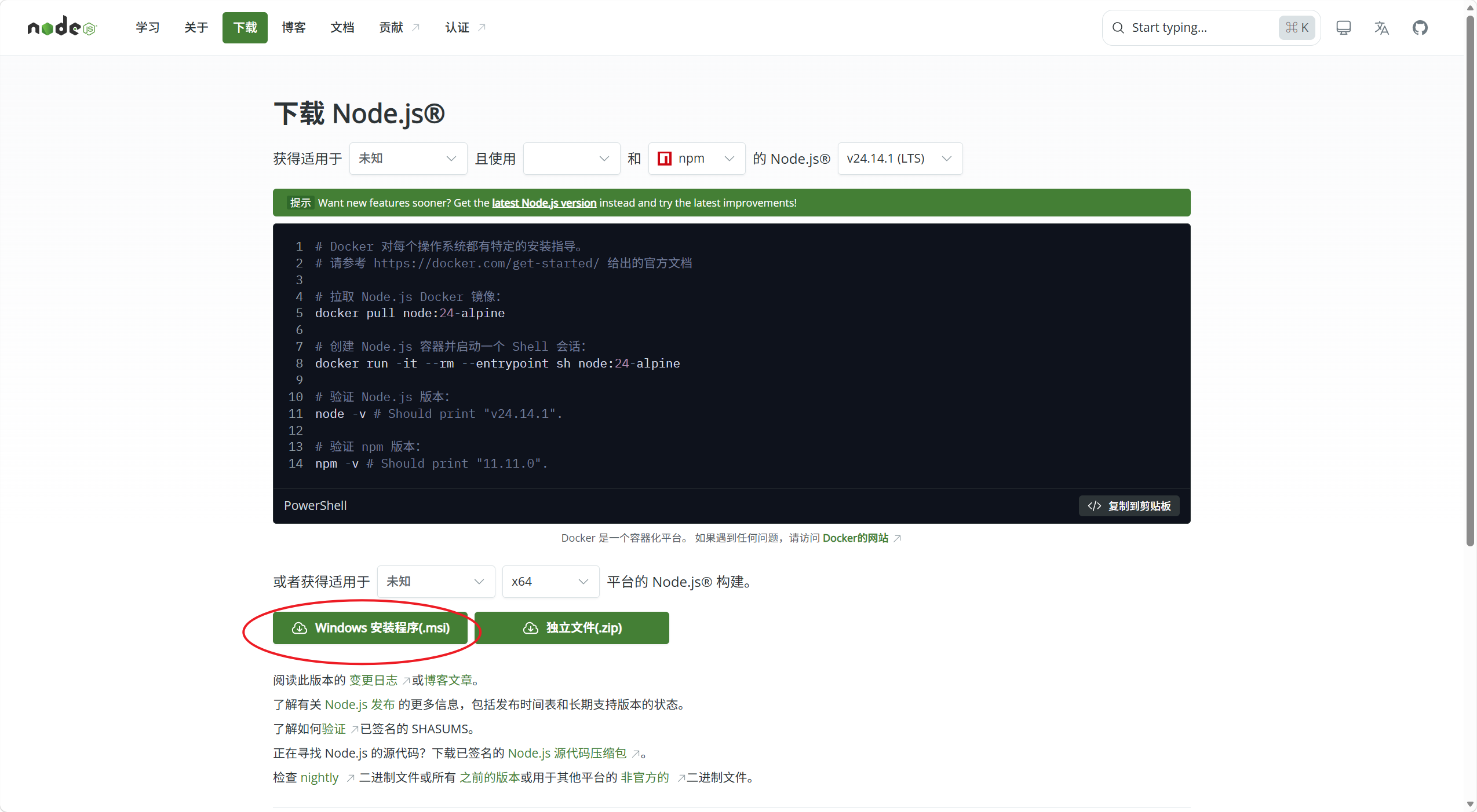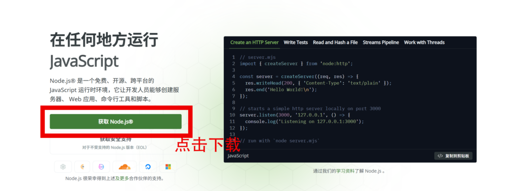 点击绿色按钮,获取Node.js,若有安装的设置一律默认即可。