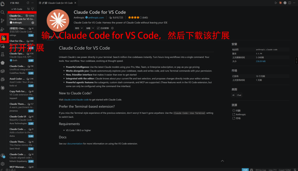 先打开vs code,然后打开扩展,安装 Claude Code for VS Code。